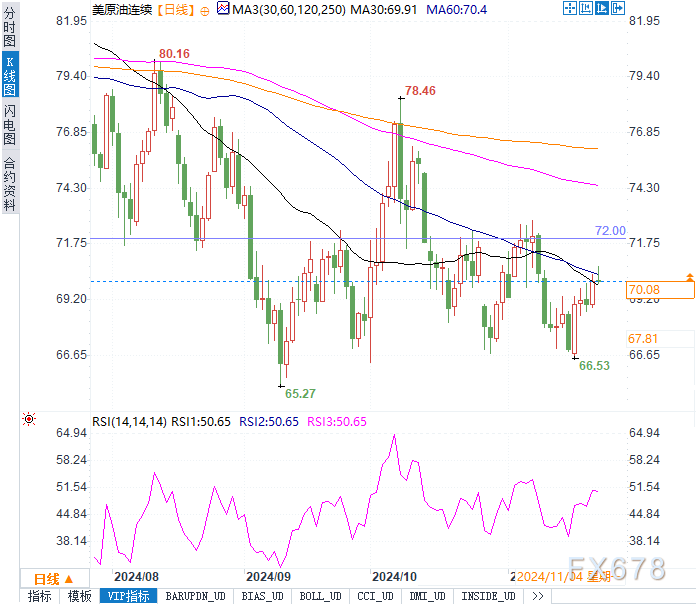 不过,欧元区疲弱的经济数据对油市构成了一定压力。最新的PMI数据显示,欧元区经济活动再次陷入收缩,制造业和服务业同步低迷。疲弱的数据加剧了市场对欧洲经济前景的担忧,也对全球能源需求的复苏形成拖累。尽管如此,高盛的分析师预计,布伦特原油价格将在70至85美元之间波动。如果美国新一届政府实施更严厉的制裁措施,价格可能触及区间上限。
