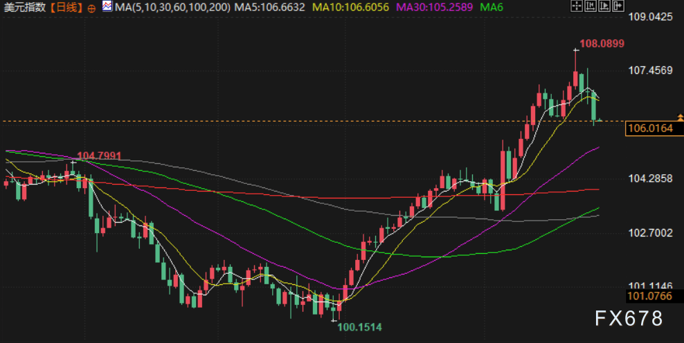 美元周三盘中跌至11月13日以来最低,在下午的交易中下跌 0.74%,报 106.06 。与上周五触及的两年高点相比下跌了1.9%。市场消化一系列凸显美国经济韧性的数据,同时投资者评估当选总统特朗普将发动一场没有赢家的关税的风险,鲜有交易商有兴趣在感恩节长周末前建立或持有头寸。周四美国市场休市,周五交易所提前闭市。