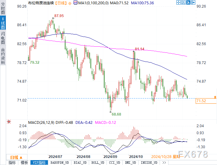 布伦特原油连续合约交投于71.58美元/桶,日内下跌0.77%;美原油连续合约报67.87美元/桶,日内跌幅0.63%。油价近期跌至关键区间下沿,逼近多年均线支撑位(100月移动平均线)。若布伦特原油持续低于70美元/桶,或触发更深远的市场连锁反应,包括利率预期调整、美元走势扭转及新兴市场货币风险溢价下降。