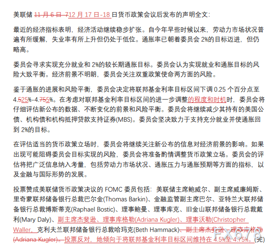 鉴于通胀的进展和风险平衡,委员会决定将联邦基金利率目标区间下调0.25个百分点至 4.25%-4.5%。在考虑对联邦基金利率目标区间的进一步调整的程度和时机时,委员会将仔细评估新公布的数据、不断变化的前景和风险平衡。委员会将继续减少其持有的美国公债、机构债和机构抵押贷款支持证券(MBS)。委员会坚决致力于支持充分就业并使通胀回到2%的目标。