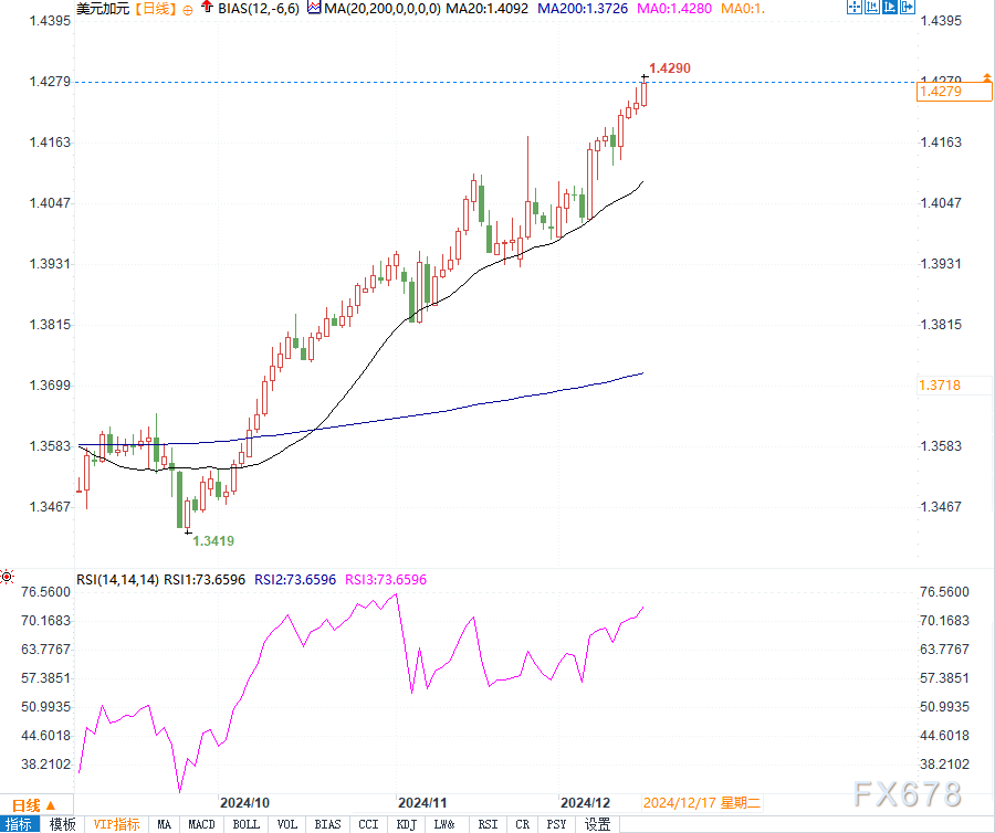 美元/加元12月17日周二盘中延续四天连涨走势,汇价创下数年新高,目前交投于1.4280附近。美元/加元受到支撑,主要因美元指数上涨收复前两日的部分跌幅,而这一走势可归因于美债收益率走高。