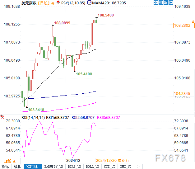 12月20日周五盘中,美元指数目前交投于108.30附近,这是自2022年11月以来的高位区间。这一走势出现在美联储宣布的鹰派25个基点降息之后,将基准贷款利率下调至4.25%-4.50%,为两年来的最低水平。