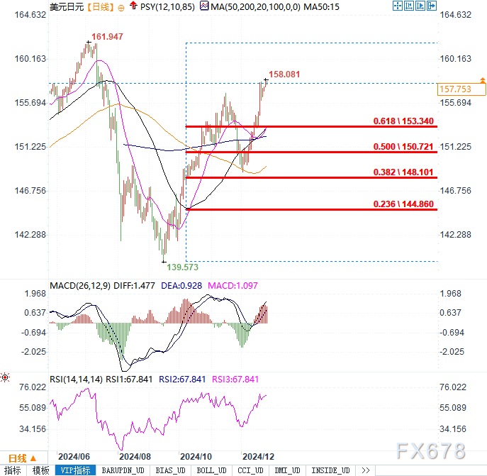 从技术面来看,美元/日元的上涨趋势依然稳固,但目前面临关键阻力位158.00的考验。以下是具体的技术分析: