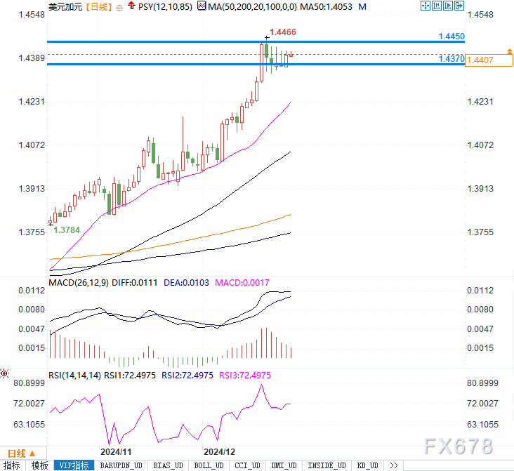 从技术面看,美元/加元目前处于盘整状态,未能突破1.4450的关键阻力位。过去几日的价格走势显示,多头虽占据一定优势,但上行动能不足。