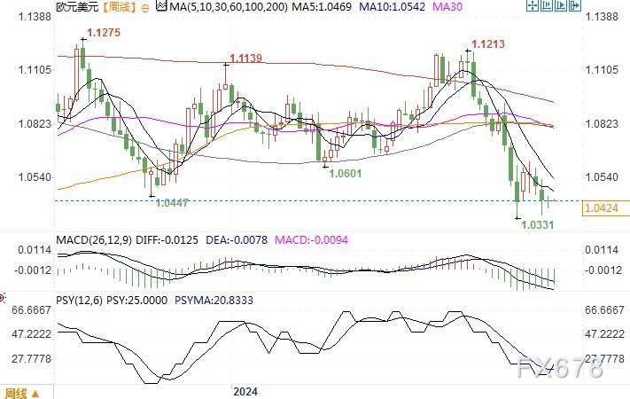 在周线图上,欧元兑美元从1.12反弹走低,落至1.0330的支撑位。虽然价格从这个低点反弹,但在再次下跌之前未能重新夺回1.0630。