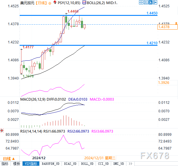 汇通网12月31日讯—— 美元/加元维持高位震荡,受原油价格回升提振加元,但美联储政策预期限制美元下行。技术面看涨趋势完好,RSI显示上行动能强,短期或测试阻力位1.4450和1.4517,支撑位于1.4210附近。