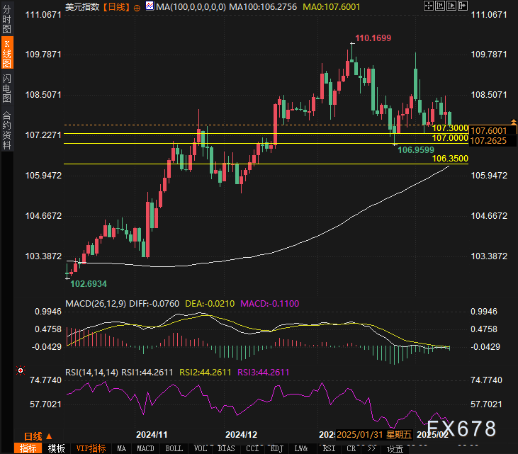 从技术面来看,美元指数(DXY)近期呈现出一定的回调迹象,当前交投于107.6165水平,并较昨日小幅回落。ING的分析师指出,短期内美元指数可能会继续面临修正压力,目标区域可能会朝向107.00至107.30之间波动,这一水平区域被认为是当前的关键支撑位。若美元指数突破107.30,可能会进一步走高,甚至挑战106.35区域。考虑到市场对关税政策的反应,短期内美元走势的变数仍较大。