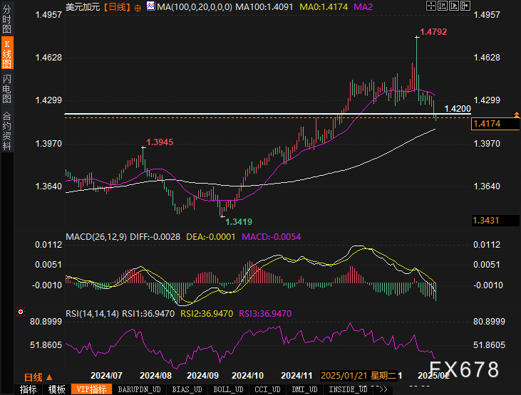 加元本周在美元走软的环境中继续上涨。USD/CAD下跌至1.4200以下。虽然美国经济数据较为疲弱,但市场依然保持风险偏好态度,推动加元上涨。加元的上涨主要受到美元疲软的影响,且市场关注下周加拿大CPI数据的表现。如果CPI数据强劲,可能进一步支持加元上涨。
