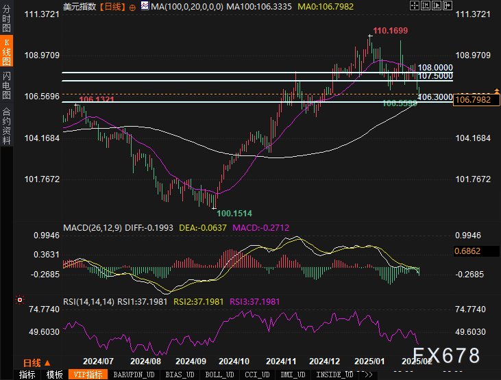美元指数(DXY)继续承压,跌破了20日SMA,展现出进一步下行的风险。RSI持续走弱,移动平均收敛发散指标(MACD)也维持在熊市区间,显示出负面动能。当前的初步支撑位位于100日SMA附近的106.30,若跌破该水平,可能确认短期看空趋势。上行阻力则位于107.50和108.00。