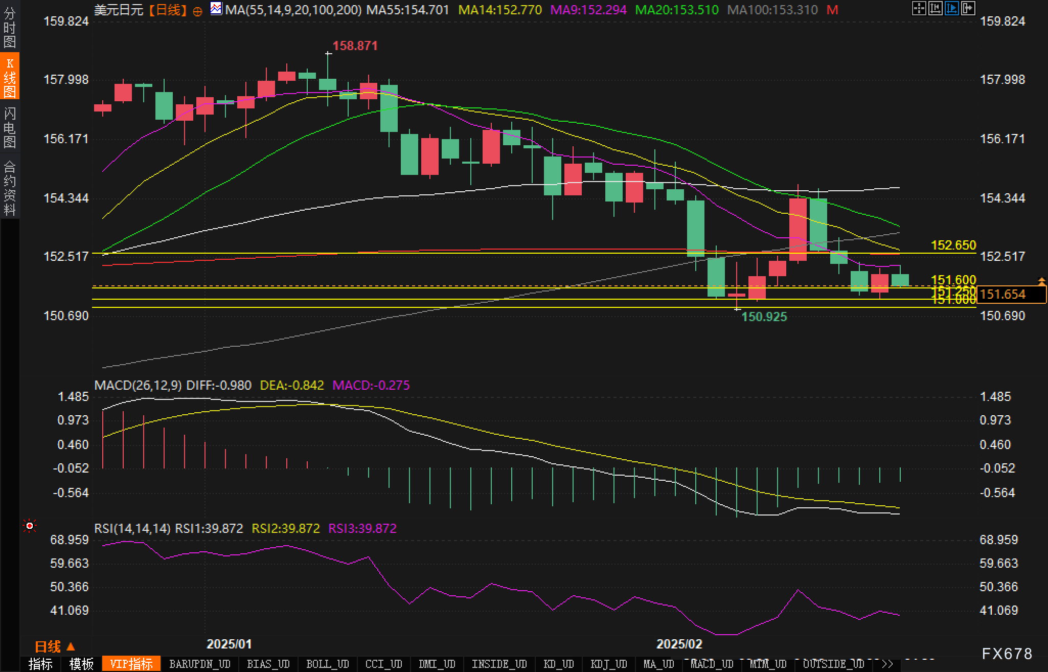 从当前技术面来看,美元/日元正面临着重要的技术支撑与阻力区间。151.60区域将是一个关键的支撑位,如果价格跌破该区域,则可能会加速下行,目标指向150.00及更低的支撑区间。然而,若美元/日元能够维持在151.60上方并突破152.65、153.00等重要阻力位,则有望反弹并测试更高的价格目标。