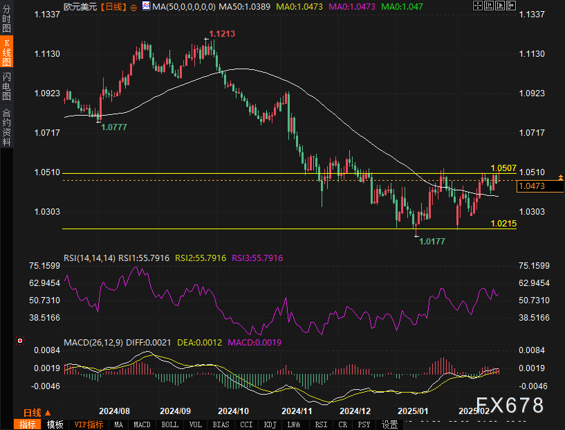 周一(2月24日),欧元兑美元汇率交投于1.0460,接近关键的阻力位1.0500。尽管市场情绪偏向风险偏好,但欧元面临的内外部因素仍在影响其走势。从美国经济数据到特朗普政府的关税政策,再到即将发布的欧洲和美国通胀数据,市场正在经历一场复杂的多重博弈。在这一背景下,欧元兑美元的走势充满不确定性,但近期的上行趋势仍然较为明显。