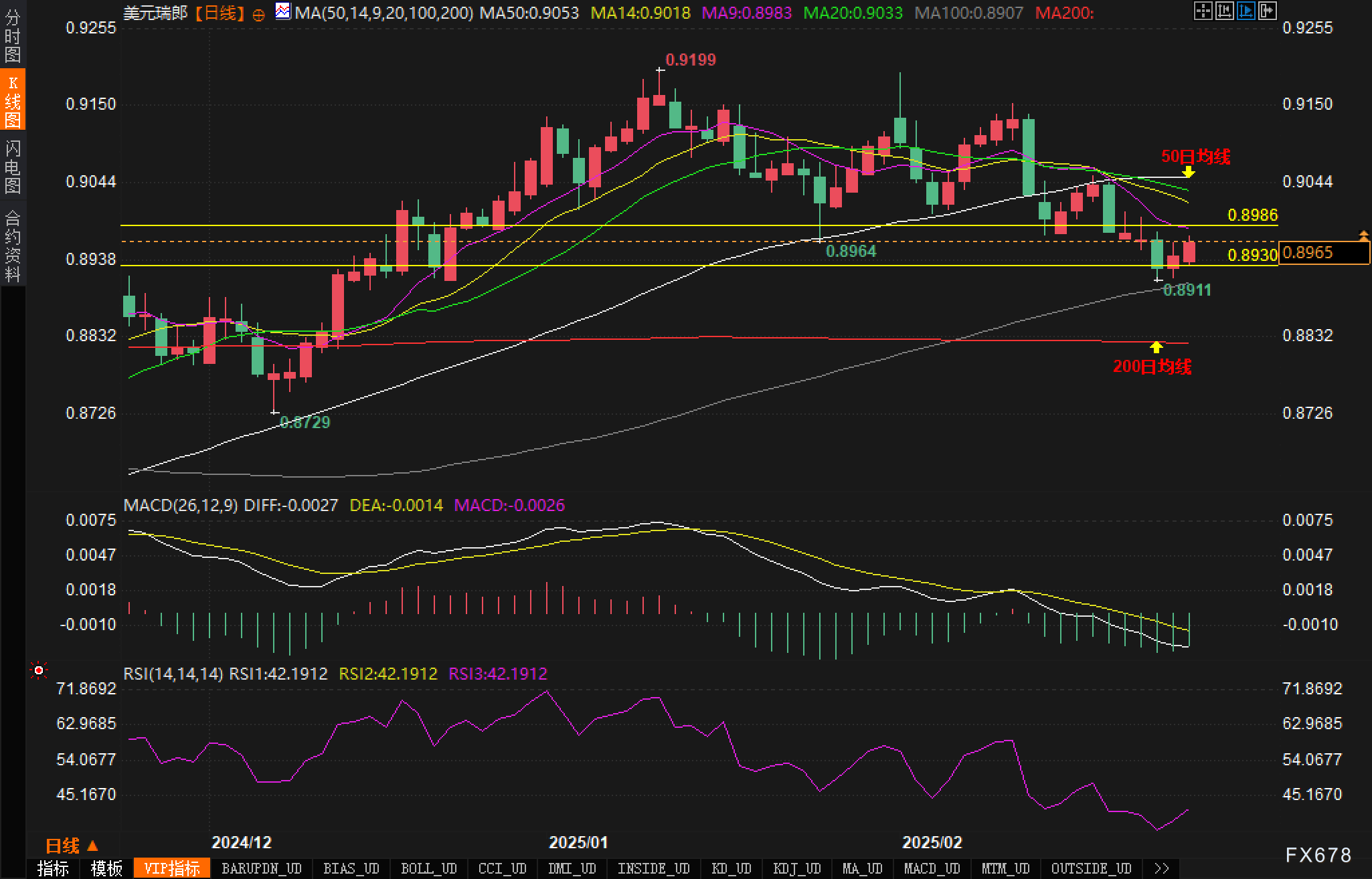 周四(2月27日)欧市盘前,美元/瑞郎表现坚挺,延续第二个交易日的上涨势头,当前维持在0.8970附近。美国经济数据的复苏以及美元的适度回升为汇价提供了一些支撑。市场将目光集中于即将公布的美国第四季度GDP数据,预计这一数据将成为市场关注的焦点。如果美国经济数据强劲,可能会进一步提振美元,推动美元/瑞郎上涨。