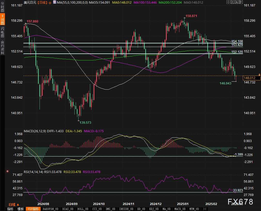 日线图显示,价格在146-149区间宽幅震荡,均线系统(MA55、MA100)缠绕走平,MACD贴近零轴,RSI中性。