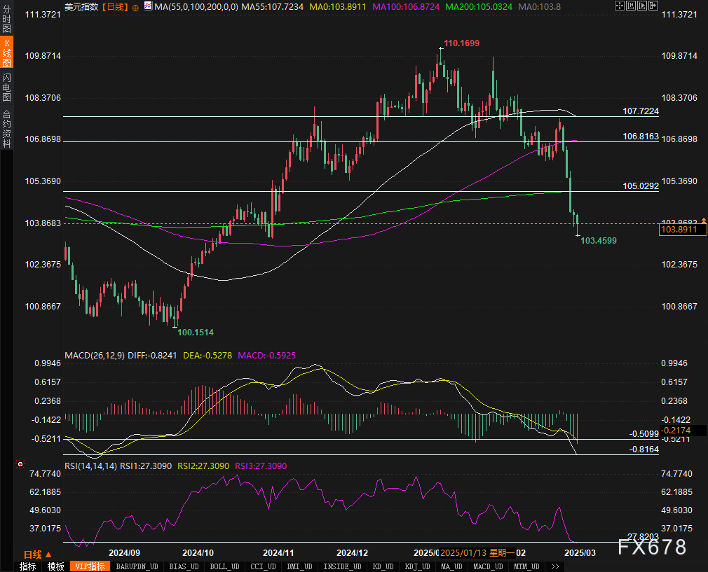 日线图显示,美元指数跌破所有关键均线(MA55、MA100、MA200),形成空头排列,MACD指标在零轴下方持续放量,DIFF与DEA线发散下行,RSI触及30超卖区域但未见反弹动能。