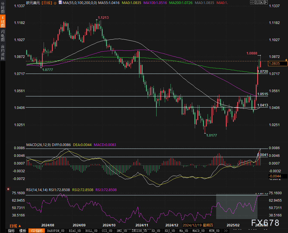 走势回顾:欧元兑美元本周强势突破1.08阻力,最高触及1.0888,周涨4.5%,创2008年以来最佳表现。德国财政改革预期及美元抛压提供双重推力。