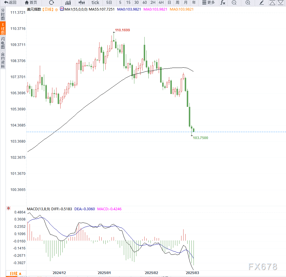 美元指数(DXY)周五微跌0.19%,至104.00附近,接近四个月低点。市场对美国经济放缓的担忧加剧,美元吸引力下降。