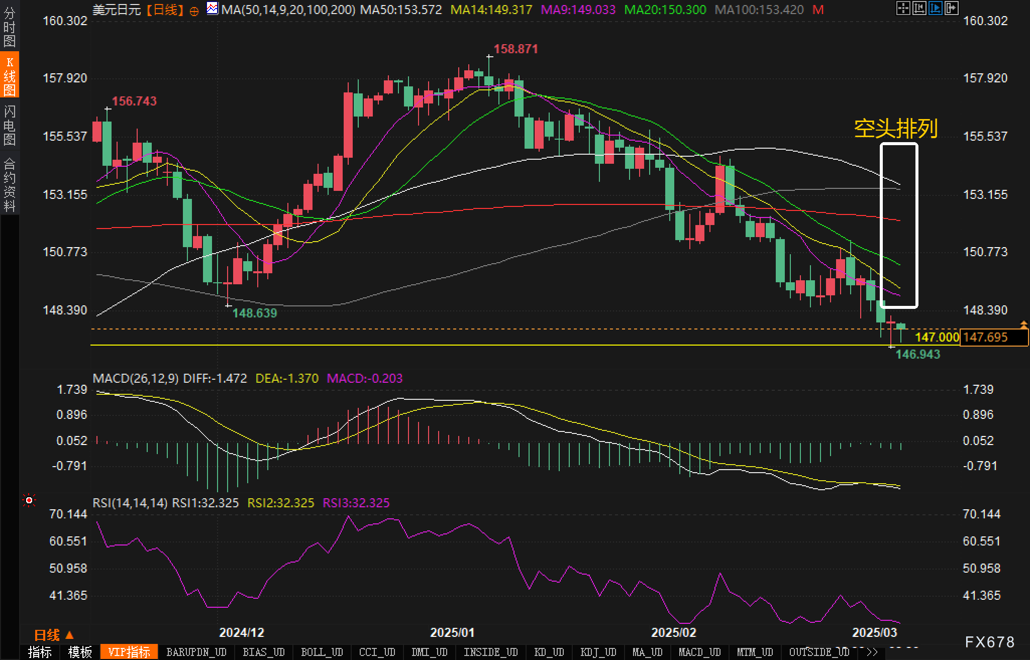 从技术面来看,美元/日元目前处于明显的下行通道中。价格已跌破多条关键均线,包括50日、100日和200日移动均线,显示出强劲的空头势头。近期的走势形成了一系列更低的高点和更低的低点,确认了下降趋势的形成。