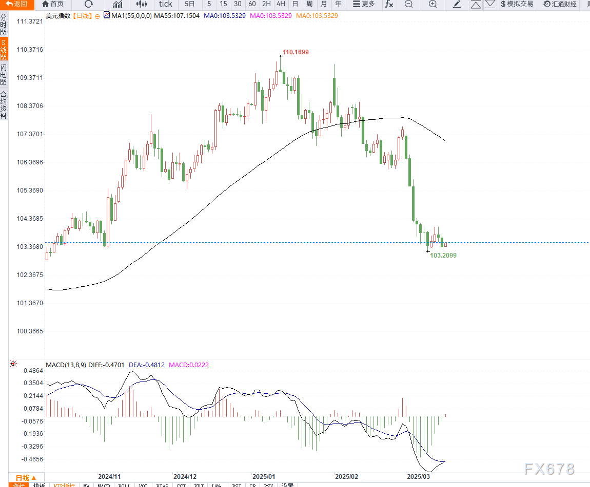 汇通网3月18日讯—— 受全球贸易担忧情绪加剧影响,美元周二继续徘徊在五个月低点,兑欧元和其他主要货币承压。美元指数自1月中旬触及110.17的两年高点以来,已下跌约6%,最新报103.44,接近上周触及的103.21低点。与此同时,市场关注本周美联储、英国央行和日本央行的政策会议,以及德国5000亿欧元经济刺激计划的投票进展。