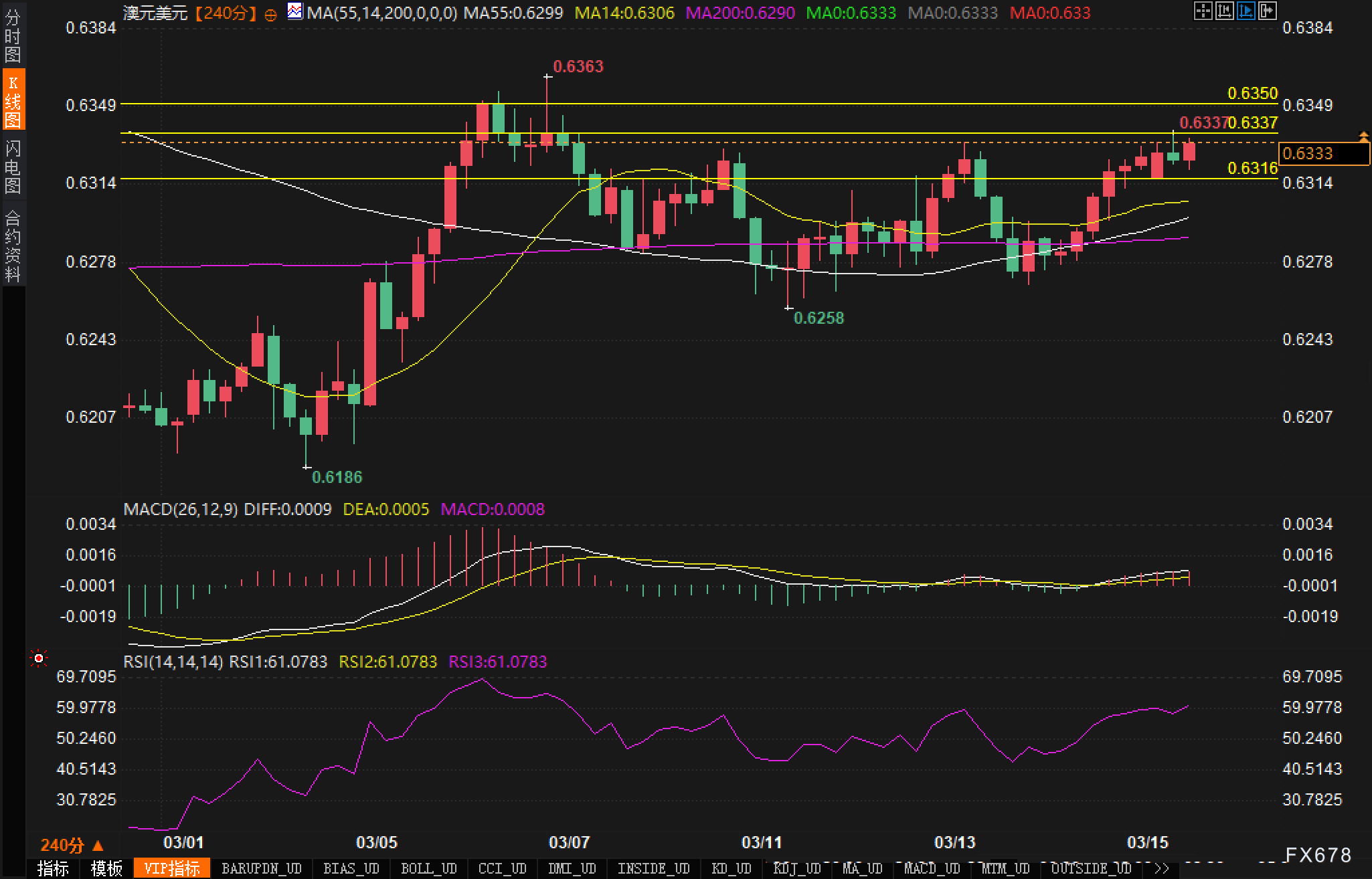 从4小时图表来看,澳元兑美元目前正在0.6333附近盘整,形成了一个关键的技术支撑位。RSI指标当前读数为61.07,处于中性偏强区域但未达到超买水平,表明汇价仍有上行空间。MACD指标显示DIFF线(0.0009)与DEA线(0.0005)之间的正向差距正在扩大,这通常预示着短期内可能继续走强。