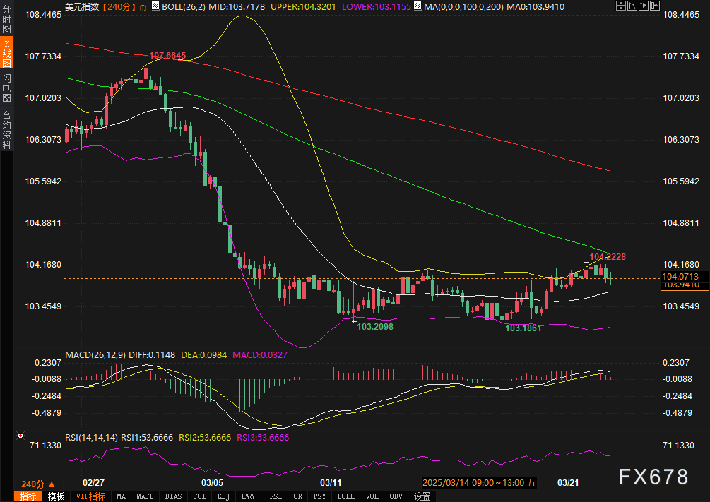 周一(3月24日),美元指数(DXY)近期在104水平附近窄幅震荡,市场焦点集中在4月2日关税政策动向及关键经济数据的发布。尽管美国政府的关税言论加剧了避险情绪,但部分国家可能被豁免的消息缓和了市场紧张氛围,美元短期走势呈现多空拉锯态势。本周消费者信心数据及核心PCE通胀指标即将公布,叠加俄乌局势谈判的不确定性,美元面临双向波动风险,技术面则指向关键阻力与支撑位的争夺。