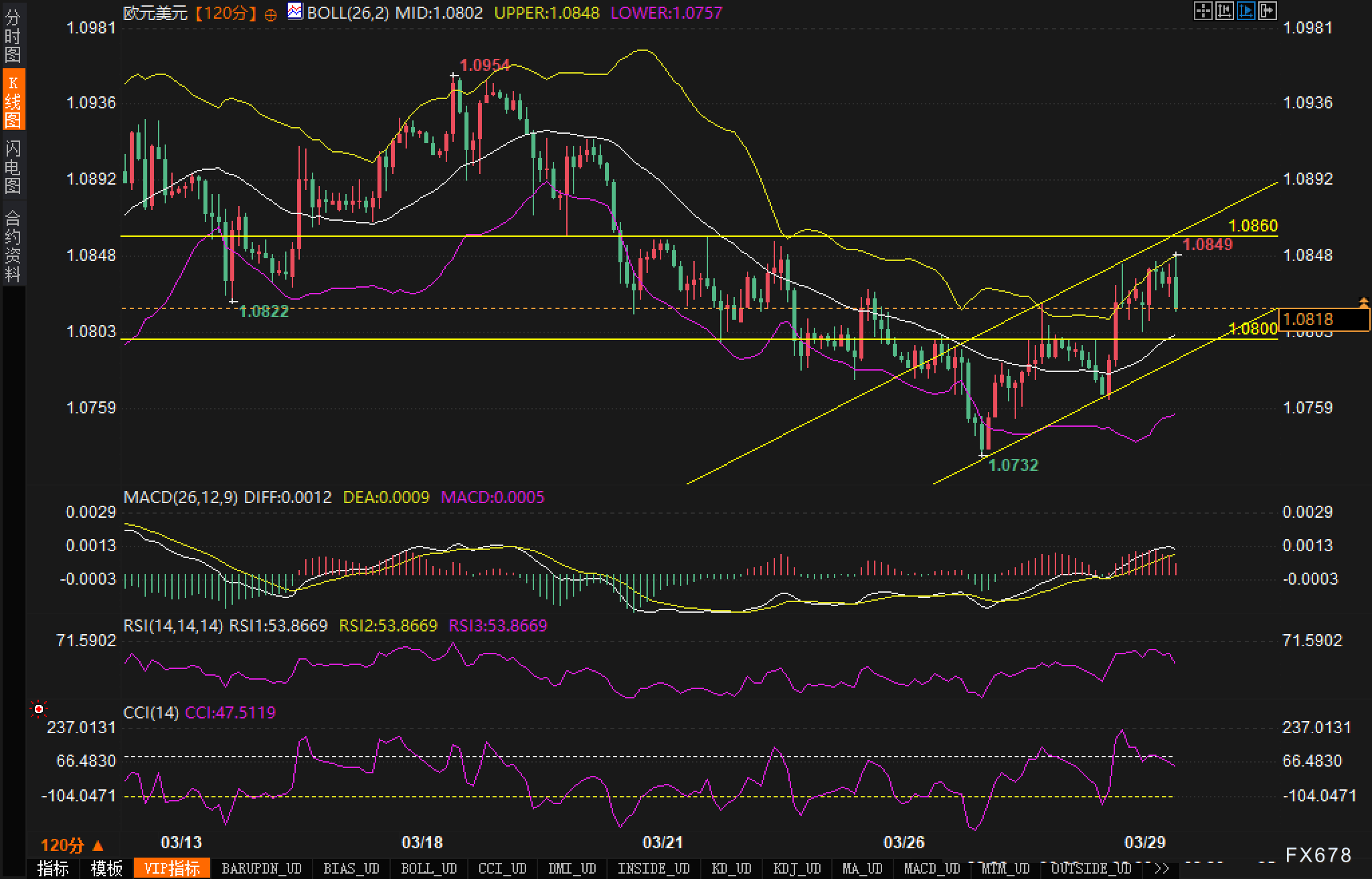 从120分钟图表来看,欧元兑美元短期下跌动能增加,但汇价仍在上升三角形结构中运行。布林带上轨(1.0848)附近形成关键阻力区域,若能有效突破,将打开上行空间。MACD指标显示DIFF(0.0012)与DEA(0.0009)均为正值且形成金叉,暗示短期多头力量仍在。RSI指标读数为53.8669,处于中性区域但略偏多头。值得注意的是,汇价在近期形成了一个上升通道,近期正测试通道上轨,若能有效突破,1.0900将成为下一目标。