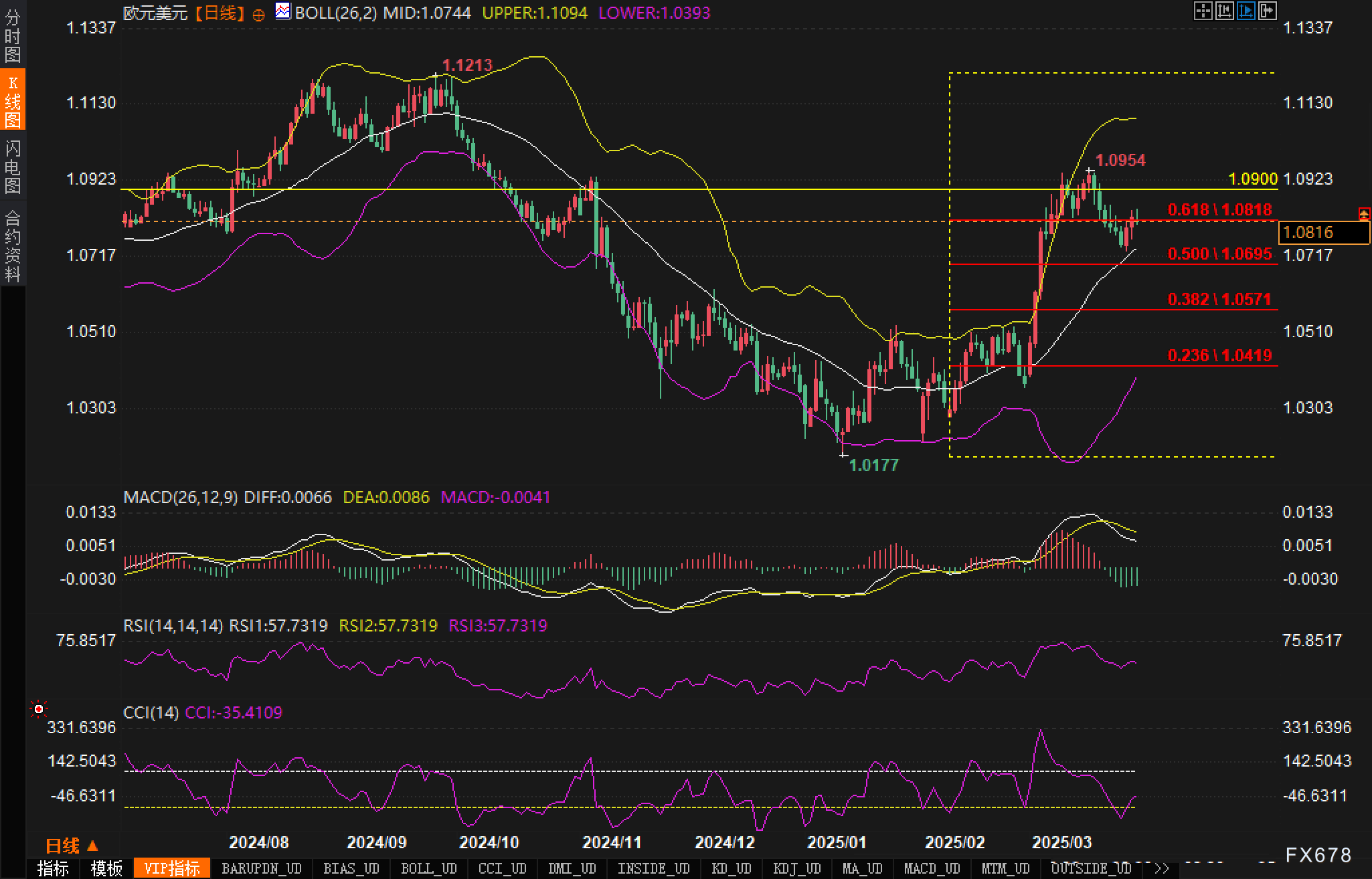从日线图表分析,欧元兑美元经历了一波自1.0177低点开始的强劲反弹,目前正在测试0.618斐波那契回撤位(1.0818)。价格已经站稳0.5回撤位(1.0695)上方,表明中期趋势偏向上行。日线MACD指标显示DIFF(0.0066)与DEA(0.0086)形成死叉,这可能暗示短期调整压力。RSI(57.7319)处于中性偏强区域,而CCI(-35.4109)则在负值区域,显示短期可能存在回调风险。从更长期来看,若价格能守住1.0695-1.0818区间,仍有望挑战1.0954前期高点。