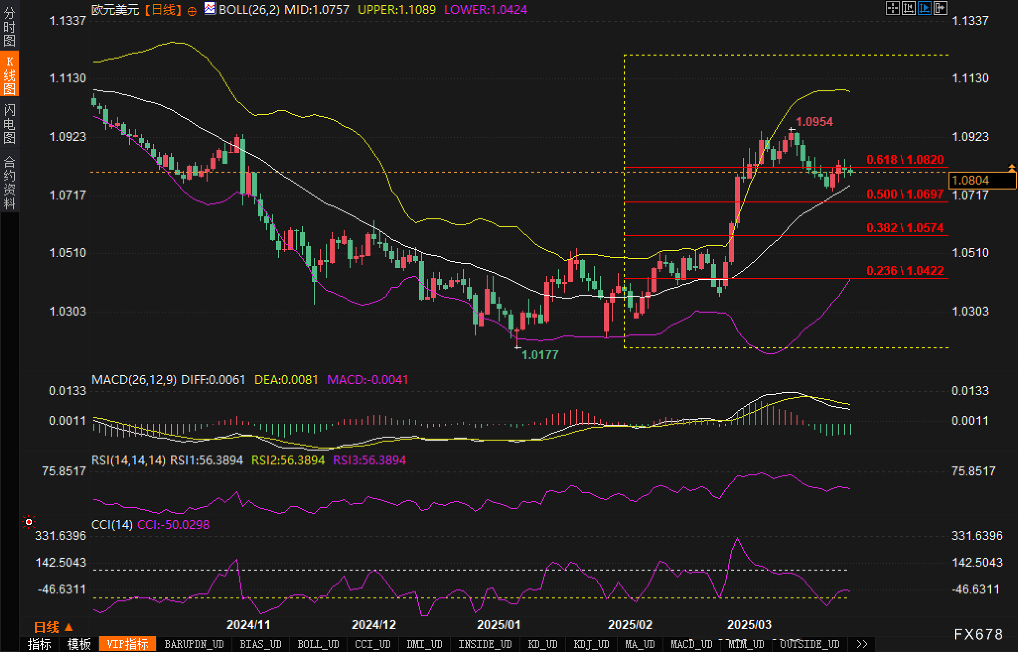 日线图显示欧元兑美元已从1.0177的低点反弹,并在0.618斐波那契回撤位1.0820附近遇到阻力。汇价目前受到布林带中轨支撑,保持在上升趋势中。MACD指标DIFF值为0.0061,DEA值为0.0081,MACD值为-0.0041,显示日线上涨动能减弱。RSI指数在56.3894,仍处于中性偏多区域。关键支撑位于0.5斐波那契回撤位1.0697。