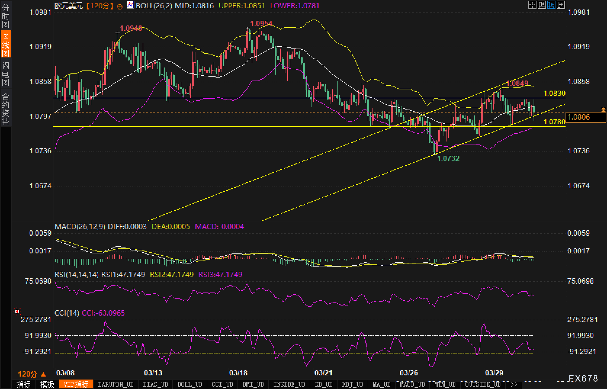 从2小时图来看,欧元兑美元处于上升通道中,目前在1.0810附近交易。价格正在测试1.0830阻力位,布林带中轨提供了一定支撑。从MACD指标来看,DIFF值为0.0003,DEA值为0.0005,MACD值为-0.0004,显示动能减弱。RSI指数处于47.17水平,在中性区域。CCI指标为-63.0965,表明短期内可能存在超卖情况。