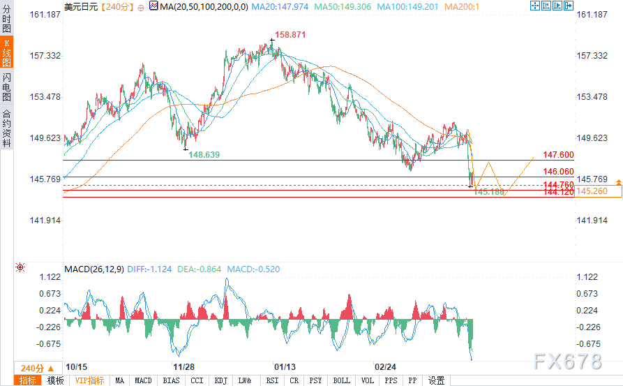 周五(4月4日),美元/日元跌幅较昨日收窄,盘中跌至145.084的6个月低点附近。昨日美元/日元大跌超过2%。
