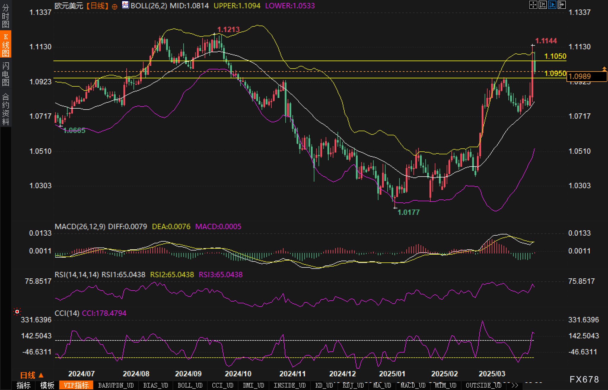 MACD指标仍显示出多头动能,DIFF线(0.0060)位于DEA线(0.0050)上方。RSI指标已回落至59.89的水平,接近超买区域但尚未进入,这表明汇价上行空间仍存,但需警惕短期继续回调风险。另外,CCI指标(20.31)已从高位回落至中性区间。