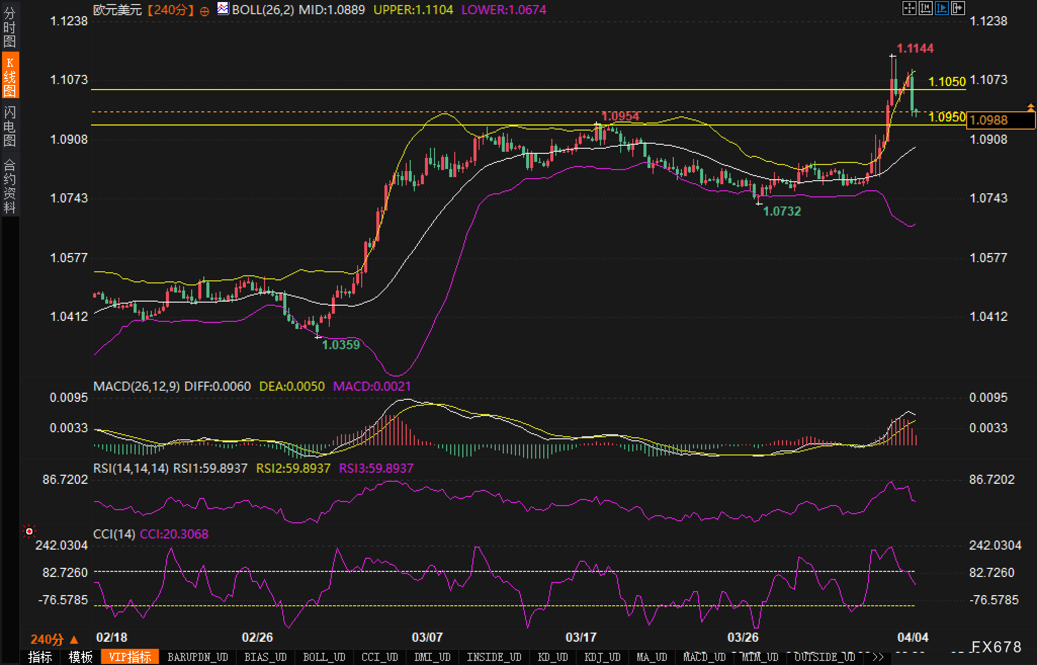 从240分钟图来看,欧元/美元汇价成功突破布林带上轨后最高触及1.1144,随后出现回调。当前汇价围绕1.0988水平震荡,明显高于中轨(1.0889)及下轨(1.0674)水平。