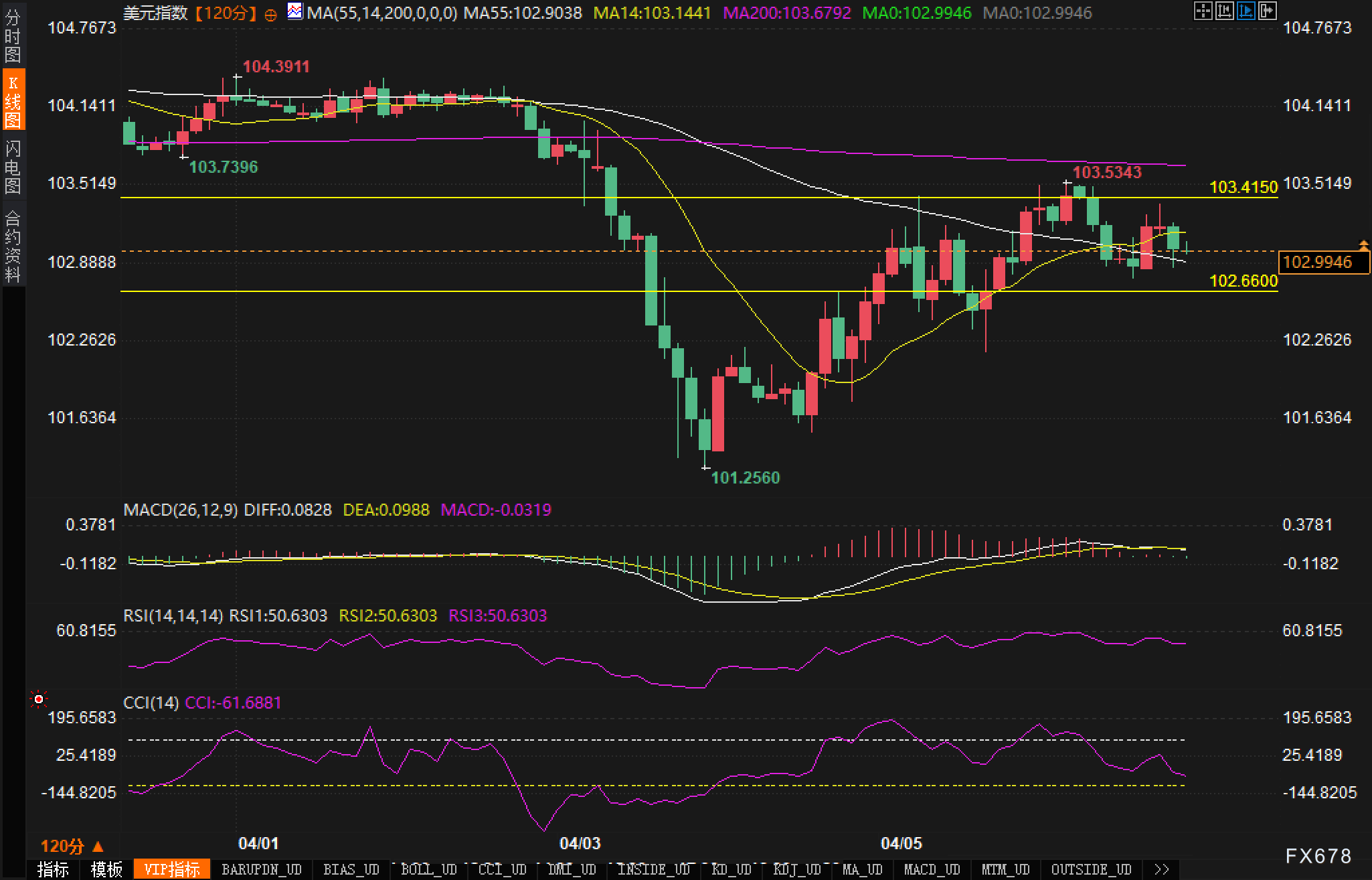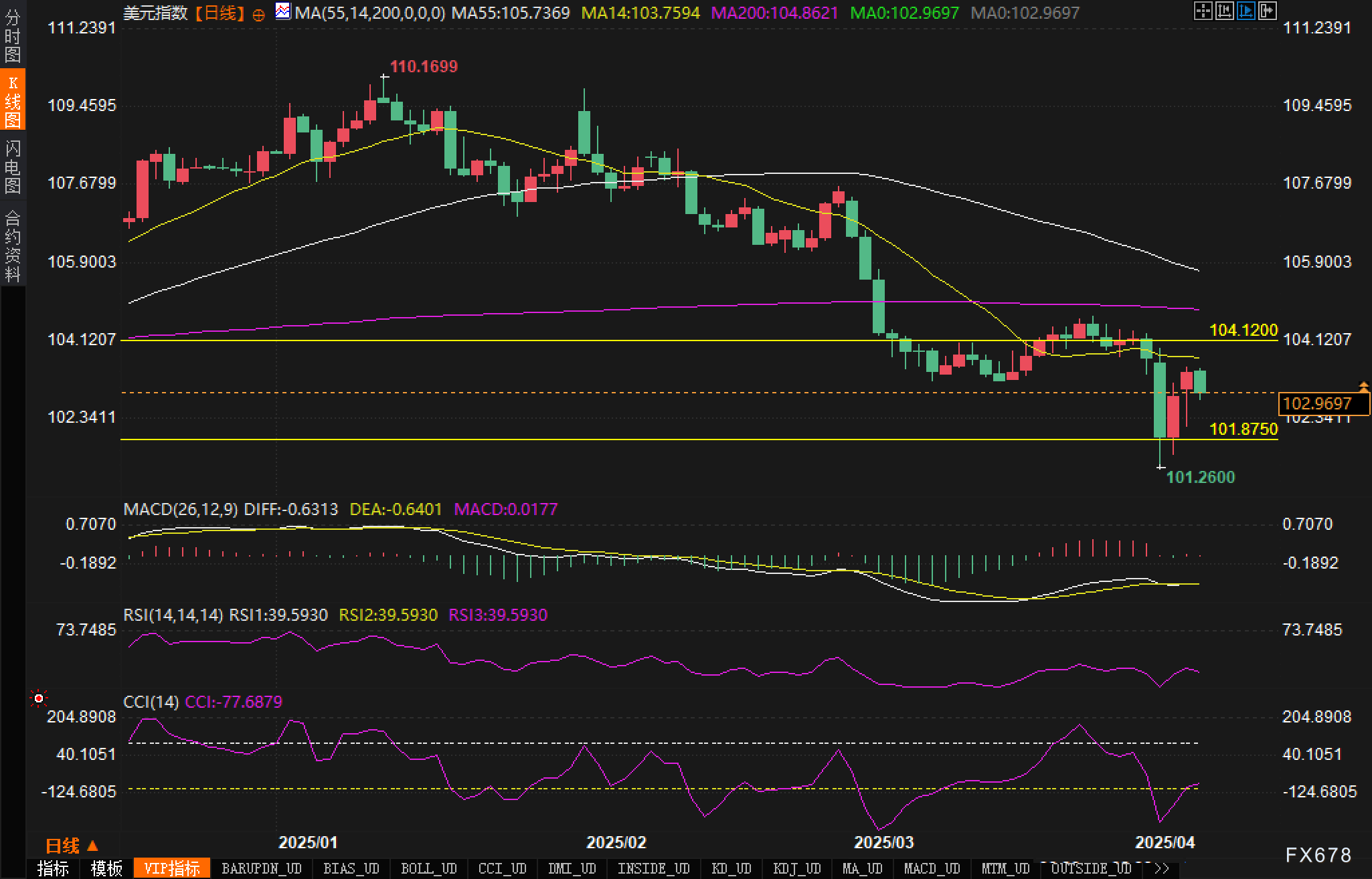 日线图分析显示,美元指数经历了一波从110.1699的高点到101.2600的深度回调。当前价格正处于MA14(103.7594)附近的关键区域。RSI指标位于39.5930,表明仍处于弱势区域但有回升迹象。值得注意的是,价格在101.8750附近获得了强劲支撑,这一区域对应上升通道的下轨。MACD指标虽然仍处于负值区域,但DIFF与DEA线之间的差距正在缩小,DIFF值为-0.6313,显示中长期下行压力正在减轻。CCI指标则从超卖区域反弹,当前读数为-77.6879,进一步佐证了反转的可能性。