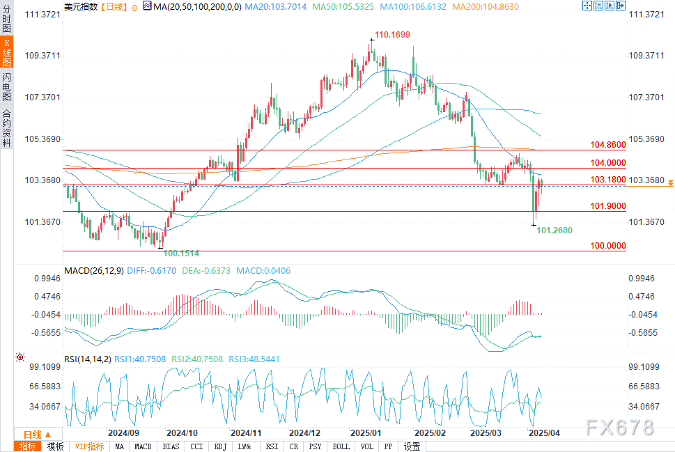 周二(4月8日)欧盘时段,美元指数盘中跌至103.13,回吐了上周短暂反弹所带来的涨幅。此前,市场曾猜测,美国可能会对几乎所有国家暂停征收关税90天,这一猜测曾令市场情绪有所改善,但这一预期很快就落空了。