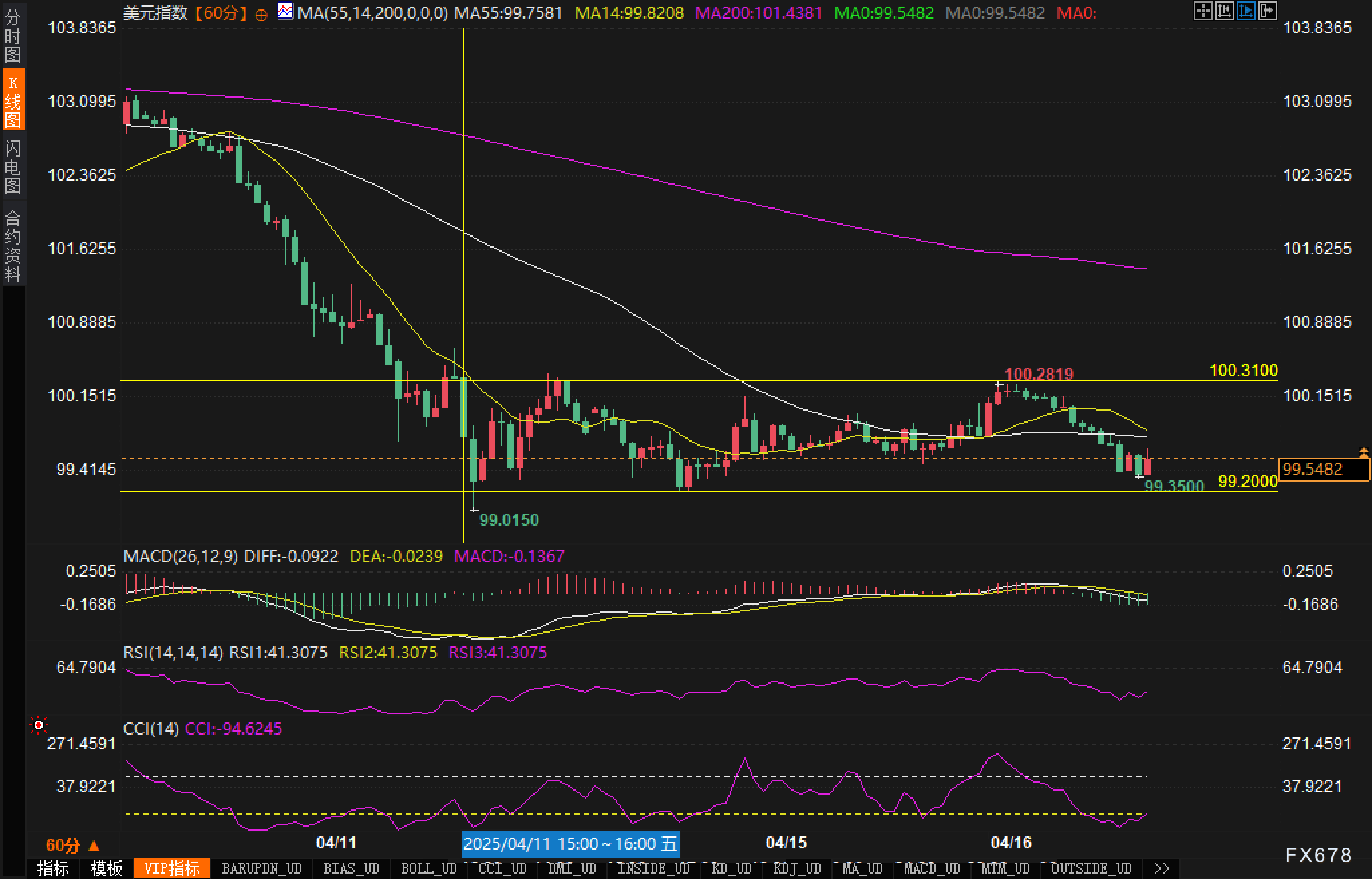 从60分钟图来看,美元指数呈现明显的下行趋势,价格已经接近99.20心理关口。MACD指标显示空头动能增强,DIFF为-0.0922,DEA为-0.0239,MACD值为-0.1367,柱状图持续位于零轴下方,表明短期下行压力仍存。RSI指标处于41.3075水平,位于中性偏弱区域,但尚未进入严重超卖状态,意味着短期内仍有继续下行的空间。值得注意的是,在100.3100附近形成了明显阻力,该位置曾多次尝试上破未果,进一步确认了当前的下行趋势。当前价格在99.50附近徘徊,若无法企稳,下一支撑位可能在99.3500和99.0150附近。