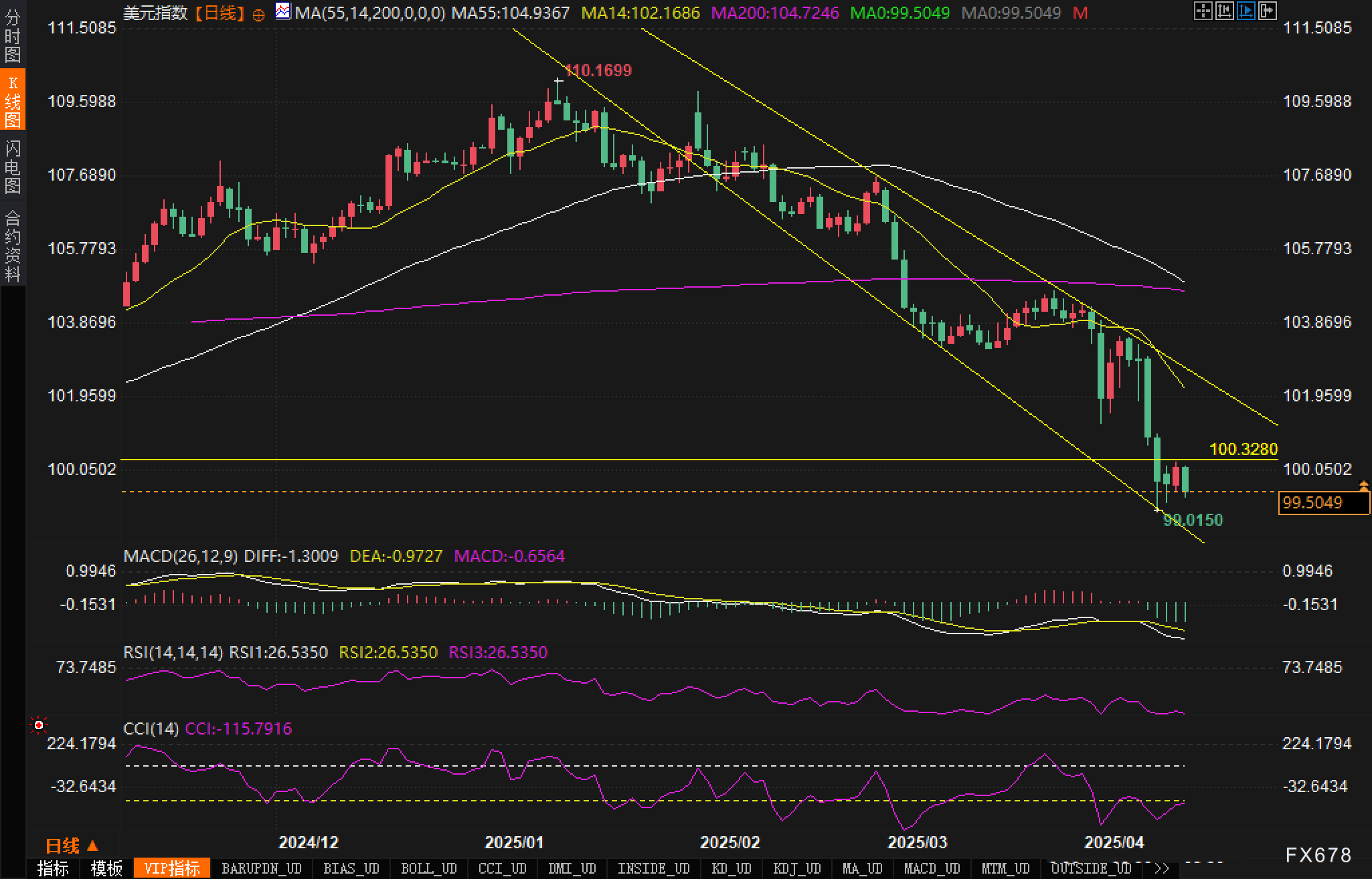 从日线图来看,美元指数正处于一个更大级别的下降通道中。价格从110.1699高点一路下滑,形成清晰的下降趋势线。近期价格跌破了100整数关口的重要心理支撑,目前在99.50附近交投。日线MACD指标显示DIFF为-1.3009,DEA为-0.9727,MACD值为-0.6564,柱状图扩大,确认了中期下行趋势的加速。RSI指标位于26.5350的低位区域,已经处于超卖状态,暗示可能出现技术性反弹。然而,从趋势的完整性来看,除非价格能重新站上100.3280的下降趋势线,否则中期看空格局难以扭转。