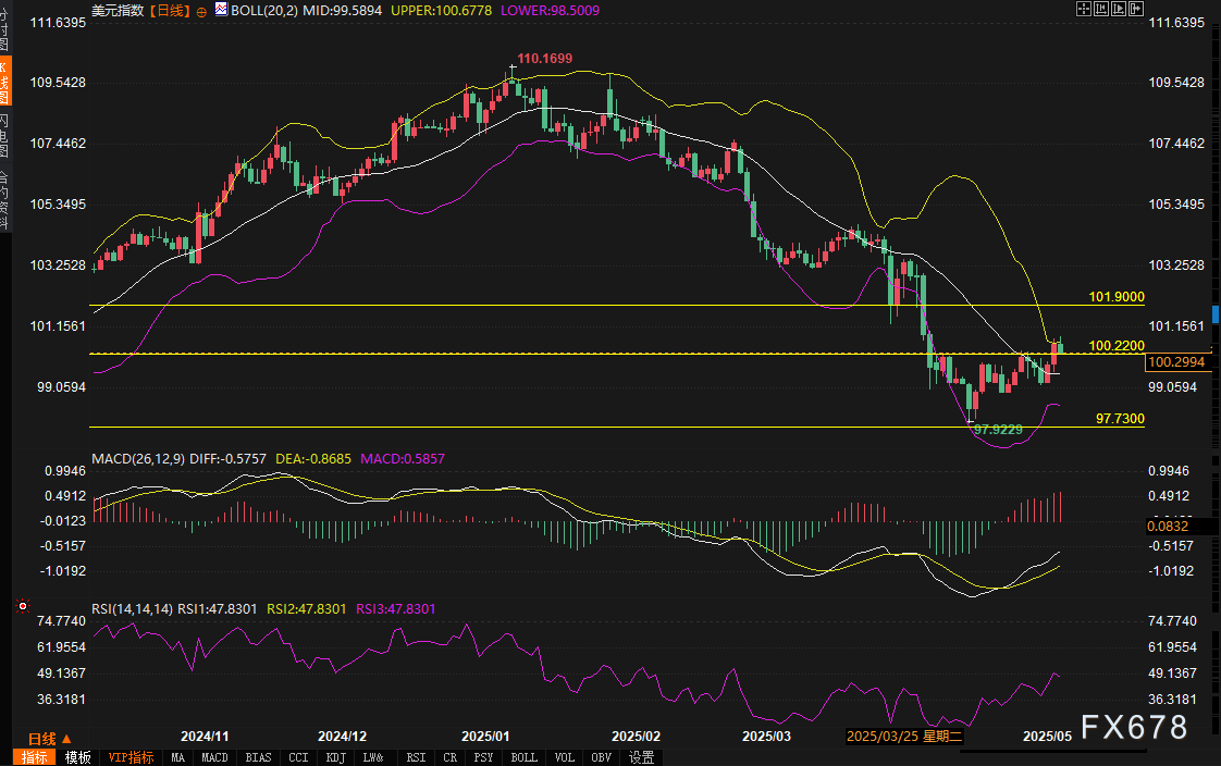 周五(5月9日),美元指数在冲高至100.86后迅速回落,这一走势反映出市场对周末贸易谈判的谨慎情绪,叠加美联储官员密集讲话前的仓位调整。技术面上,布林带中轨99.5934与上轨100.6936形成短期压制,MACD柱状图虽仍处负值区间(-0.5695),但快慢线收敛迹象明显,显示多空博弈加剧。
