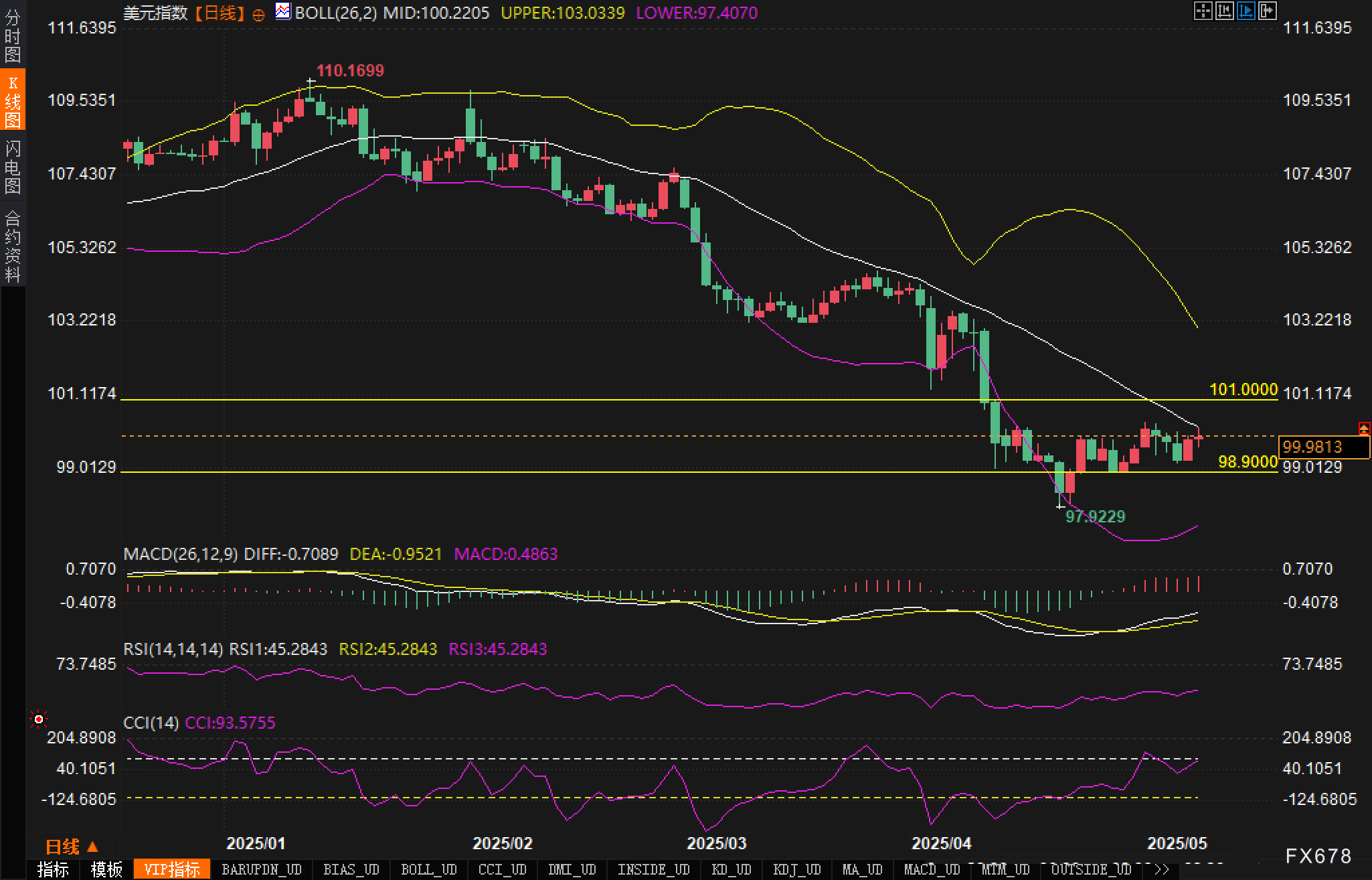 从美元指数日线图观察,当前价格运行于布林带中下轨之间,布林带整体开口,反映出波动率有所扩大。指数自高点110.1699持续下行,阶段低点出现在97.9229,随后展开震荡反弹。短期内,99.00附近构成关键支撑位,而101.00成为当前最直接的上方阻力区。