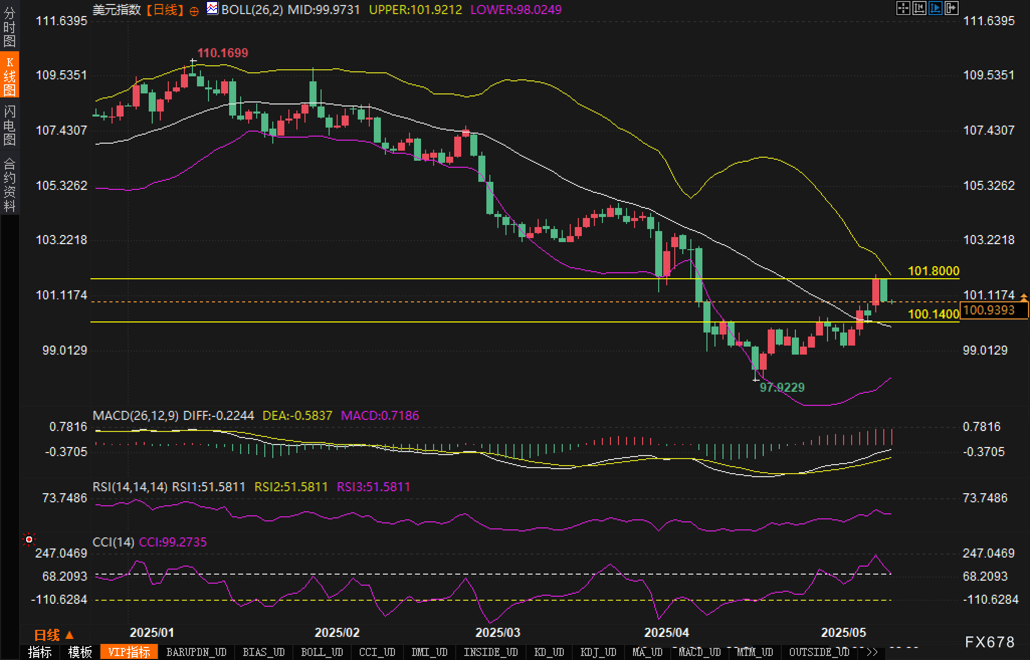 布林带显示上轨位于101.92,下轨位于98.02,形成较宽的波动区间。价格目前受到99.97中轴线的牵制,短期内交易员关注能否有效突破101.80阻力位。若突破失败,可能再次回落至100.14支撑位附近。