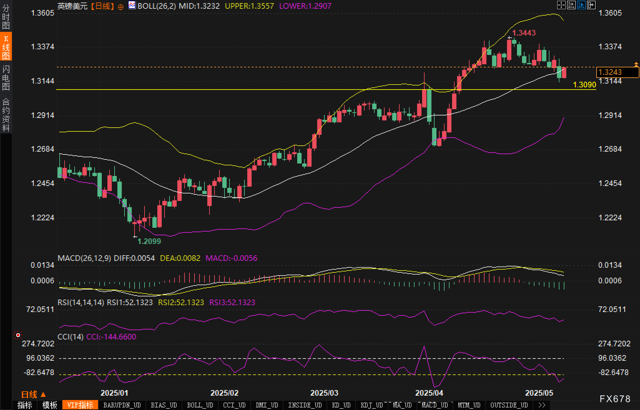 布林带指标显示中轨位于1.3232,为当前价格提供技术支撑。如该支撑被有效击破,下一支撑区域在1.3090附近。