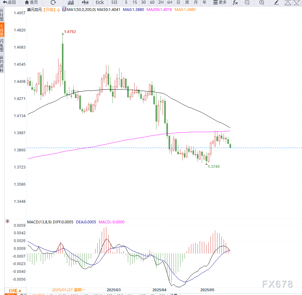 从技术面来看,USD/CAD已跌破1.3920-1.3940的短期盘整区域下沿,伴随连续多日阴线排列,显示空头动能持续增强。若跌破1.3860一线,或将进一步测试1.3800甚至1.3750区域支撑。当前反弹空间有限,汇价倾向于延续下行趋势。