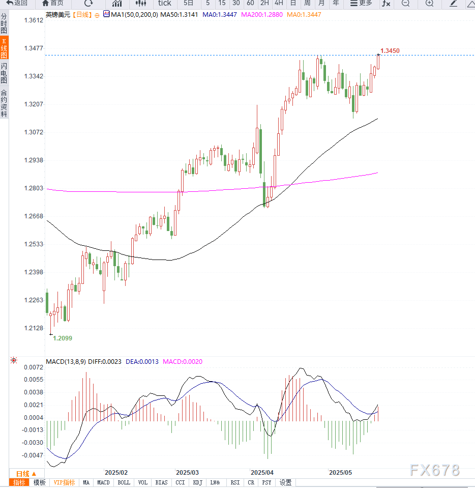 日线图形来看,英镑兑美元(GBP/USD)汇率已升至1.3445,创下自2022年2月以来的最高水平。从日线图来看,汇价已突破1.3433的关键阻力位,显示出强劲的上行势头。