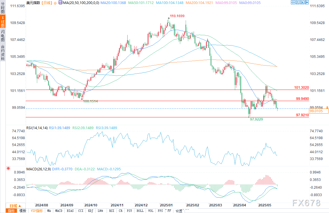 周一(5月26日)美盘时段,美元指数跌破5月6日99.172的支撑位,加剧了看跌情绪。这表明除技术形态外,市场存在更深层次的结构性担忧。交易员目前关注97.921一线,除非空头回补推动指数反弹至阻力位99.949上方,否则市场动能倾向于继续下行。这一突破与穆迪将美国信用评级下调至Aa1相符,突显了市场对华盛顿超过2万亿美元的赤字和飙升的偿债成本日益不满。