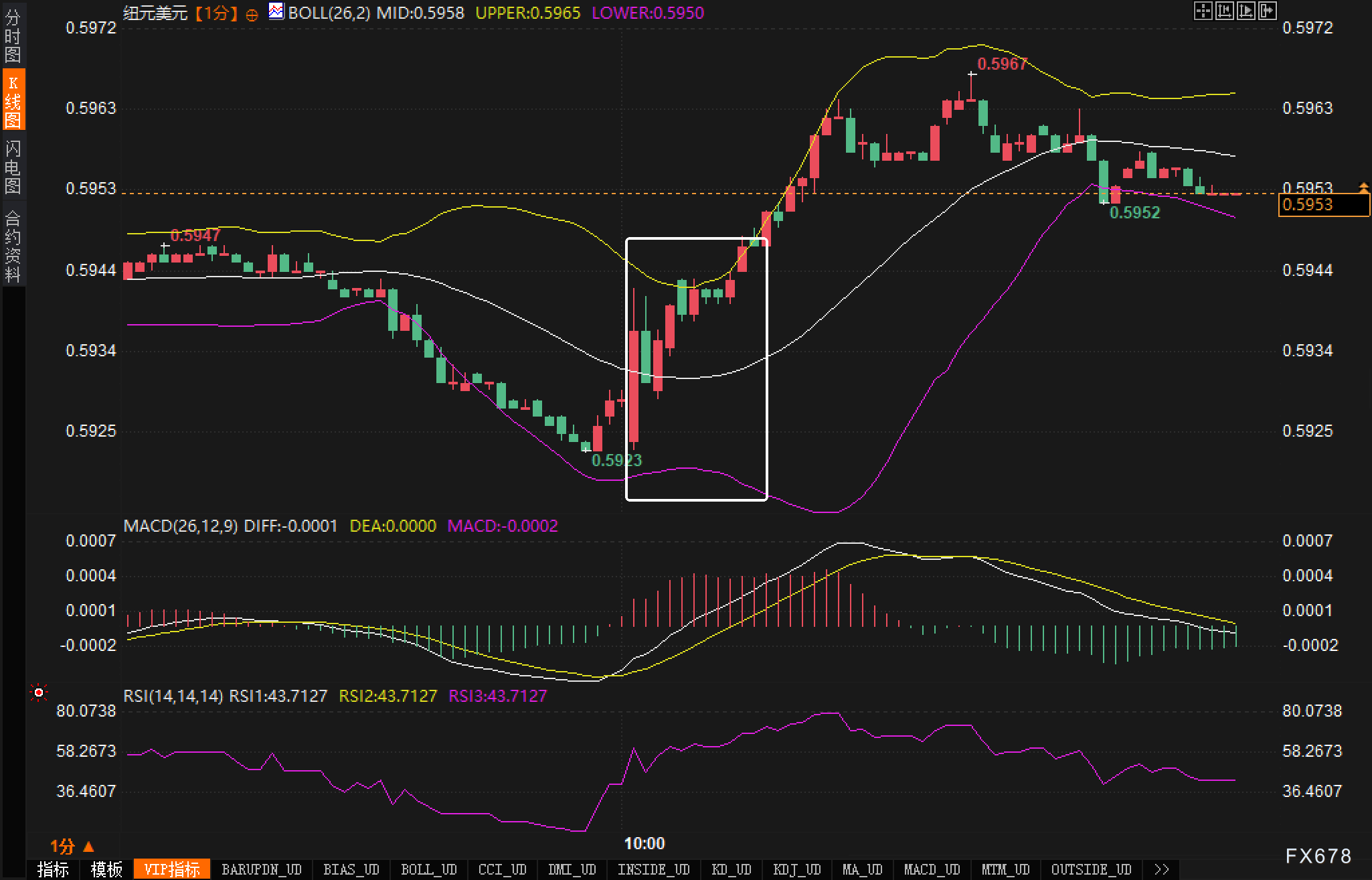 从技术图表分析,纽元/美元在0.5970水平面临阻力,该位置恰好与布林带中轨重合。决议结果公布后,汇价在触及0.5967高点后开始回落。当前MACD指标显示动能减弱,RSI指标在43.71水平,处于偏弱区域但尚未进入超卖。
