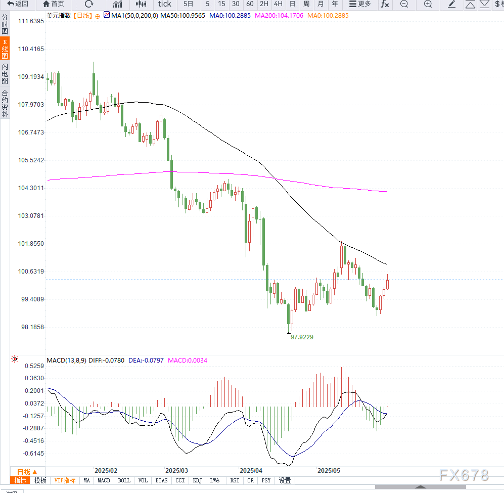 从美元指数日线图来看,价格成功突破近一周横盘区间,并重新站上100整数关口,表明短线反弹动能增强。技术指标方面,MACD接近形成金叉,RSI指标回升至50上方,显示买盘力量有所恢复。
