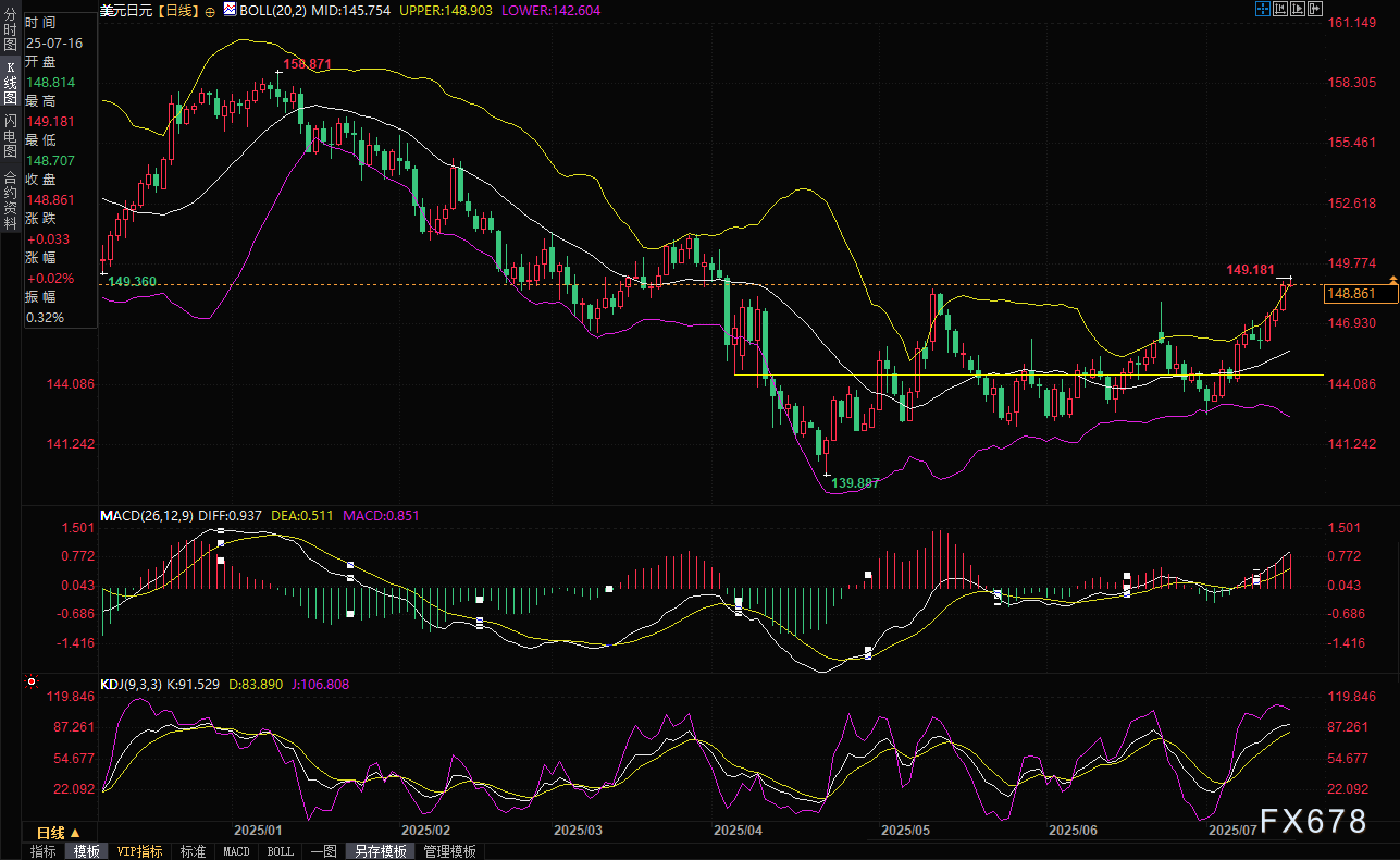 此外,7月20日参议院选举前的国内政治不确定性加剧了日元压力。而美元指数则稳守6月23日以来高位,因美国通胀微升强化了美联储推迟降息的预期。这些因素共同推动美元/日元在过去两周强势攀升。