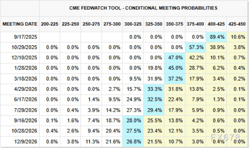 这种预期已经反映在市场上。根据芝商所的数据,9月17日将利率降至4.25%的概率已升至89.4%。此外,对于10月29日的会议,进一步降息至4.00%的概率为57.3%。