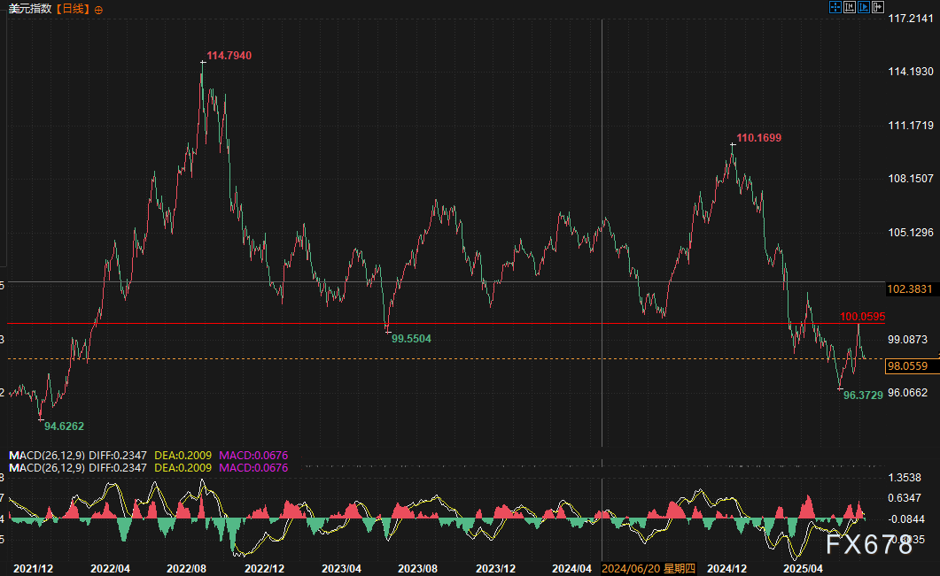 通过追踪美元兑一篮子货币的美元指数的表现,可以更明显地看出美元的疲软。近日,该指数已跌破100整数关口,目前徘徊在98关口附近,暗示美元可能开启新一轮的看跌行情。