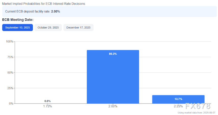 相比之下,欧洲央行似乎已经结束了其漫长的降息周期。9月10日的下一次会议上,存款利率维持在2.00%的概率为86.3%,这表明在今年早些时候几次降息之后,欧洲央行现在认为中性的货币政策立场是合适的。