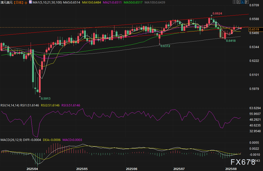 在本周二(8月12日)澳洲联储会议召开前,澳元保持稳定,现交投于0.6510附近,市场普遍预计澳洲联储将降息 25 个基点,尽管这一举措已被市场充分预计,但交易员们仍将关注货币政策声明的基调,以寻找今年是否有再次降息的线索。与此同时美国CPI即将发布可能给澳元汇价蒙上阴影。