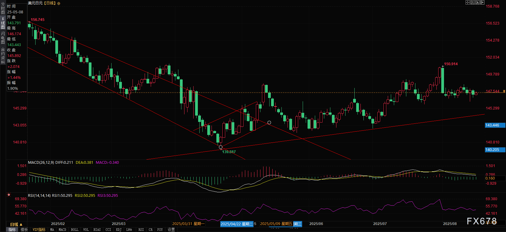 对交易者而言,8月的操作策略始终是在147.00下方逢低买入,在148.00上方逢高抛售。在鲍威尔讲话前,若无重大催化剂出现,这一策略恐难改变。下方支撑位依次看146.00和144.40,其中4月上升趋势线位于144.60附近;上方阻力位则关注149.00和151.00。相对强弱指数(RSI14)和MACD等动量指标呈中性,这意味着当前更应关注价格走势本身,而非预设方向性立场。